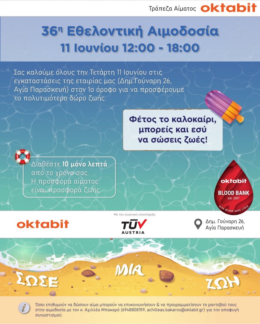 H Οktabit διοργανώνει στις 11 Ιουνίου 2025 την «36η Εθελοντική Αιμοδοσία της Τράπεζας Αίματος Oktabit» και με χαρά προσκαλεί τους συνεργάτες της στη γιορτή προσφοράς και αλληλεγγύης.